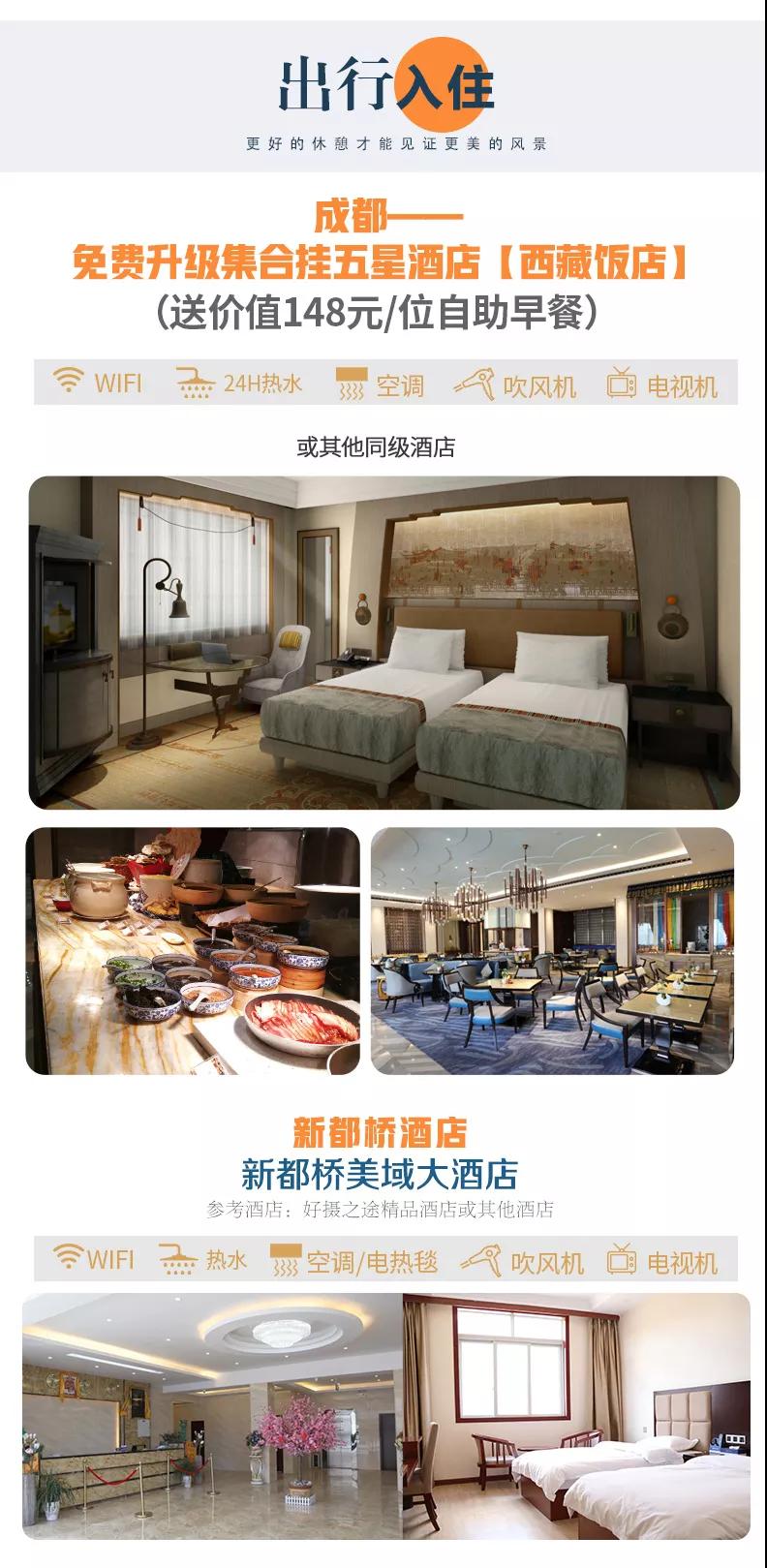 3、住宿:行程所列10晚住宿費(fèi),免費(fèi)升級一晚出行前成都集合掛五酒店(西藏飯店,含148元自助早餐);因沿途條件有限,如酒店設(shè)施達(dá)不到您的期望,請您諒解。
