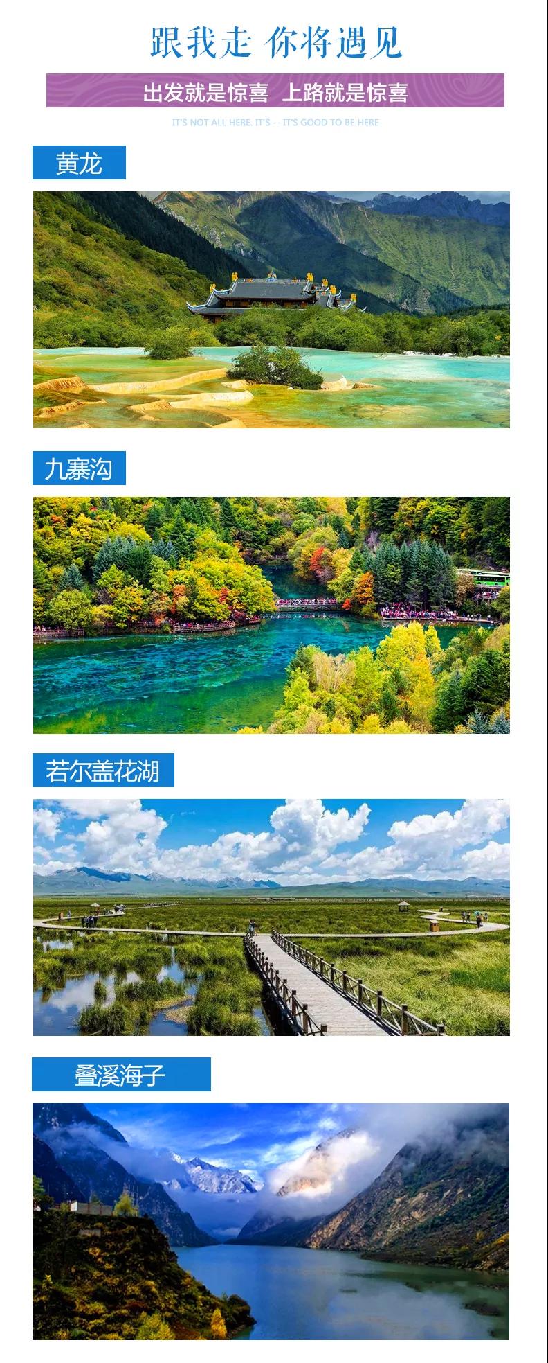 九寨溝門票、黃龍風(fēng)景區(qū)門票、若爾蓋花湖門票(花湖景區(qū)暫未確定開放時(shí)間,如出發(fā)日景區(qū)未開放,則調(diào)整為游覽若爾蓋草原);
