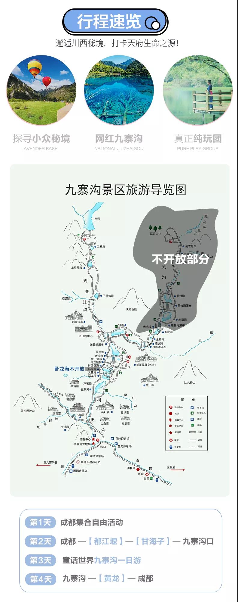 4、九寨溝景區(qū)實行分區(qū)域開放,開放區(qū)域為溝口經諾日朗瀑布至長海,扎如溝的扎如寺及日則溝的鏡海;其中,長海、五彩池、鏡海、諾日朗瀑布、樹正群海、雙龍海瀑布、扎如寺等景觀原則上為步行游覽區(qū),具體游覽方式請聽從隨車講解員安排。