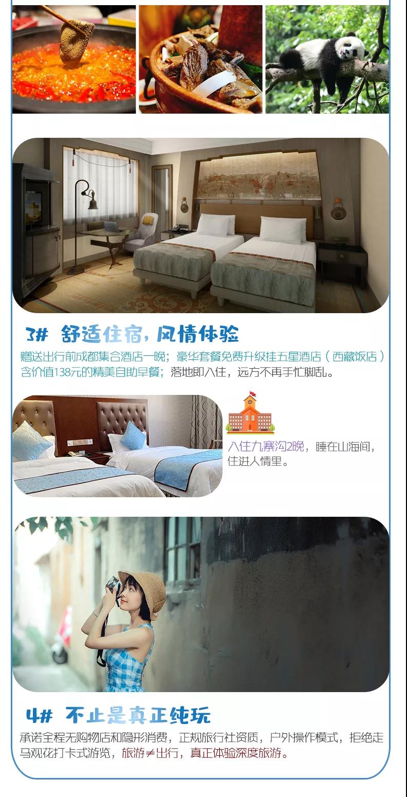 住宿:含4晚住宿;舒適標(biāo)準(zhǔn)全程準(zhǔn)四酒店;豪華標(biāo)準(zhǔn)全程準(zhǔn)五酒店,免費(fèi)升級(jí)2晚成都掛五星酒店。參考酒店如下: