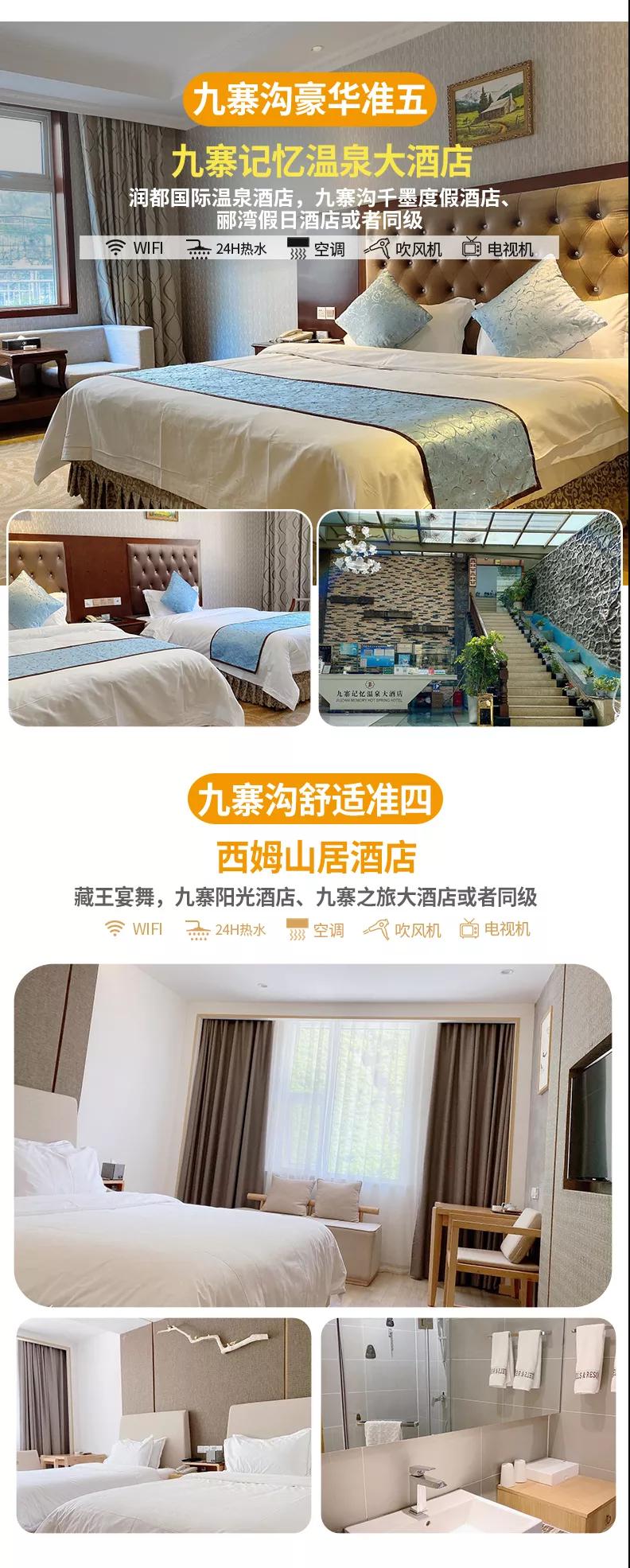豪華準(zhǔn)五:九寨記憶溫泉大酒店,潤(rùn)都國(guó)際溫泉酒店,九寨溝千墨度假酒店、酈灣假日酒店或者同級(jí)