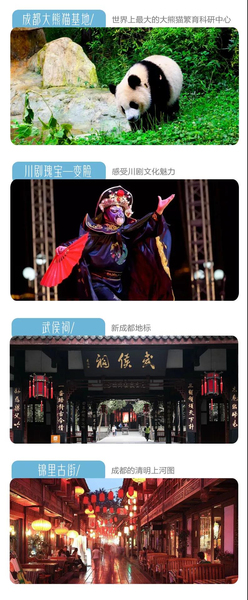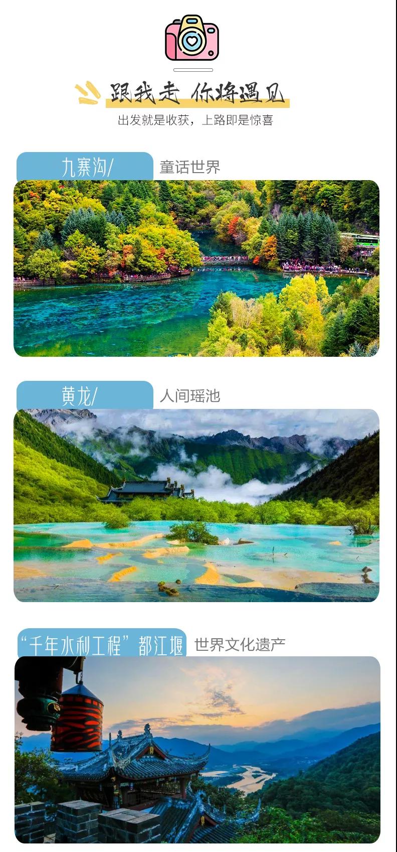 門票:九寨溝門票、黃龍風(fēng)景區(qū)門票、成都熊貓基地門票、武侯祠門票、都江堰門票;