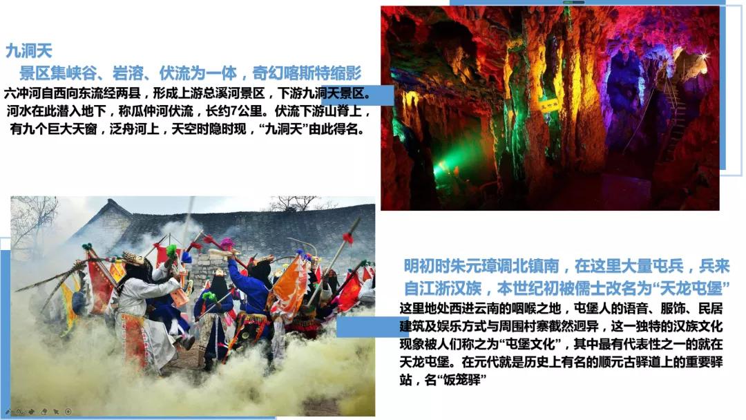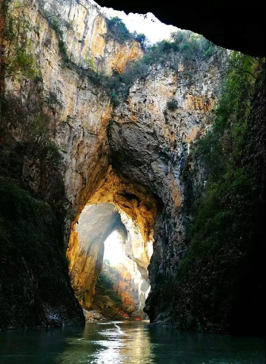 早餐后前往1989年與黃果樹瀑布一道被評為貴州省十大風景名勝區(qū)之一的九洞天。九洞天是國務院授予國家級重點風景名勝區(qū)之一,是烏江干流六仲河上游流經兩縣之間的一段以伏流(當?shù)厝私嘘幒樱榇淼目λ固鼐C合地貌。該段伏流時隱時現(xiàn),神奇莫測,形成地下河,當?shù)厝朔Q瓜仲河,長約7公里,在下游長約6公里的河段上,箱形切割頂板多處塌陷,形成了大小不同,形狀各異的天窗洞口,使伏流明暗交替,洞洞相連,組合成集伏流、峽谷、洞穴、天橋、天坑、及生物化石為一體的雄奇瑰麗的巖溶大觀。