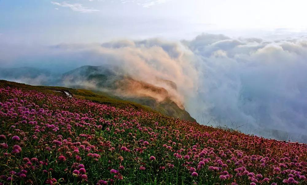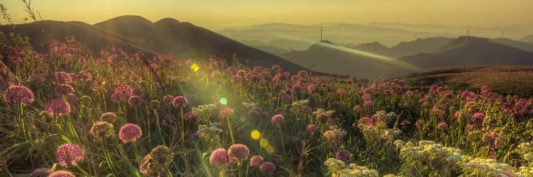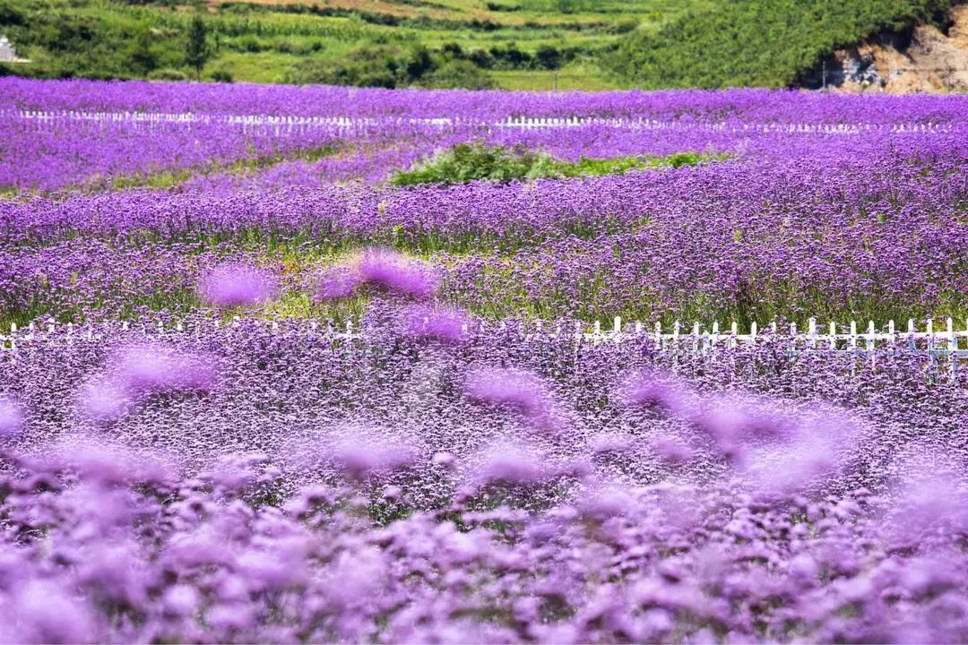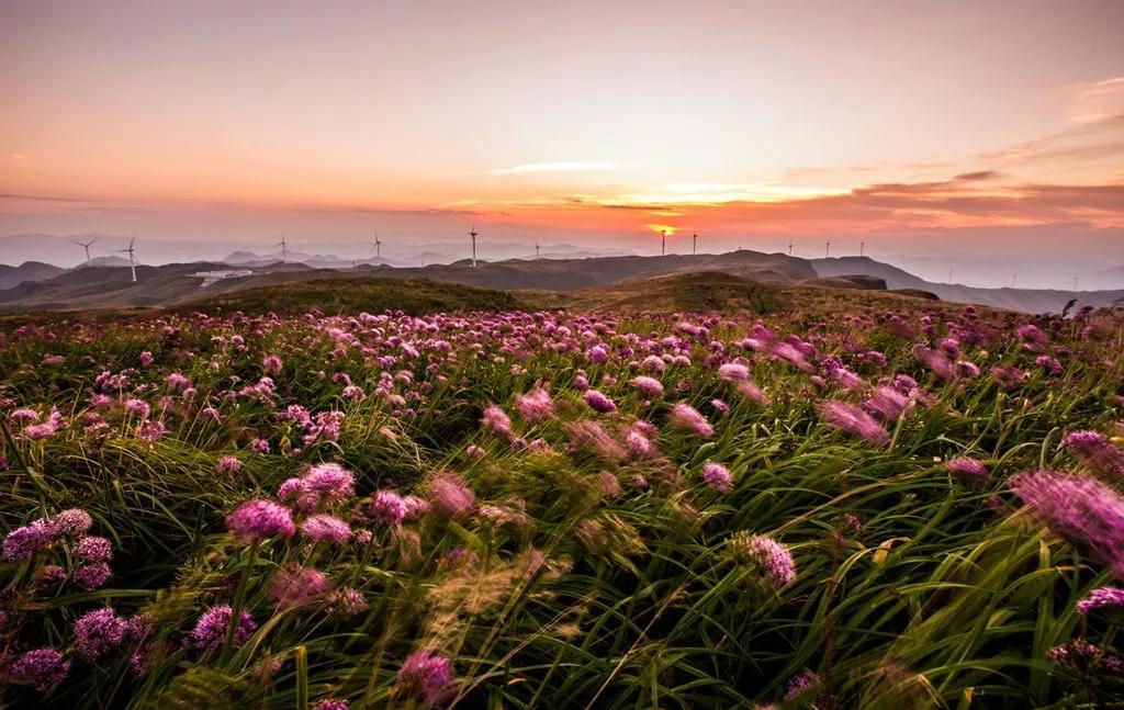 今天我們驅車來到云上花海的韭菜坪山腳下,為了能欣賞到韭菜坪最美的日出景象,我們把重頭戲放到了第二天一早,而今天大家在山下游玩拍照,這里盛開著一望無際紫色的馬鞭草 ,也可以上山去拍一個日落霞光哦。