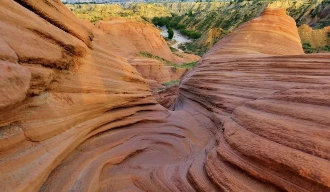 波浪谷展示的是由數(shù)百萬年的風(fēng)、水和時間雕琢砂巖而成的奇妙世界。層層疊疊的石頭就像一大批鋪蓋在地面上浸染過后晾曬的紅色布匹,一層層、一卷卷、一盤盤在夕陽的渲染之下,異常的鮮紅; 與溝底一處處流淌細小的河水和遠處覆滿綠色植被山頂上轉(zhuǎn)動的風(fēng)車構(gòu)成了一幅優(yōu)美的實景畫。