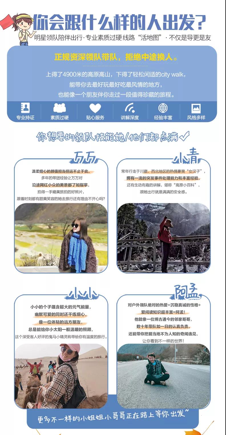 私人訂制:我們業(yè)務(wù)范圍囊括了全國各大城市,川西、西北、東北,在路上永遠(yuǎn)有我們的身影。我們將為每一個(gè)有定制需求的你策劃出獨(dú)屬于自己的完美旅行。