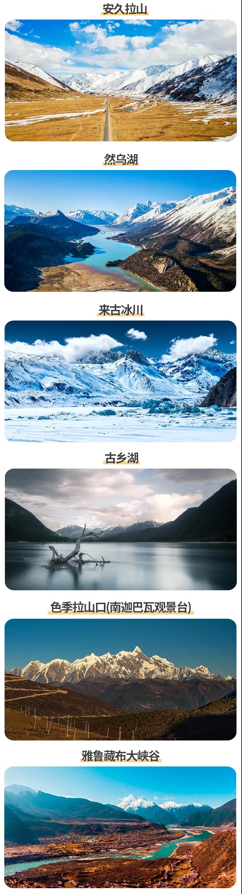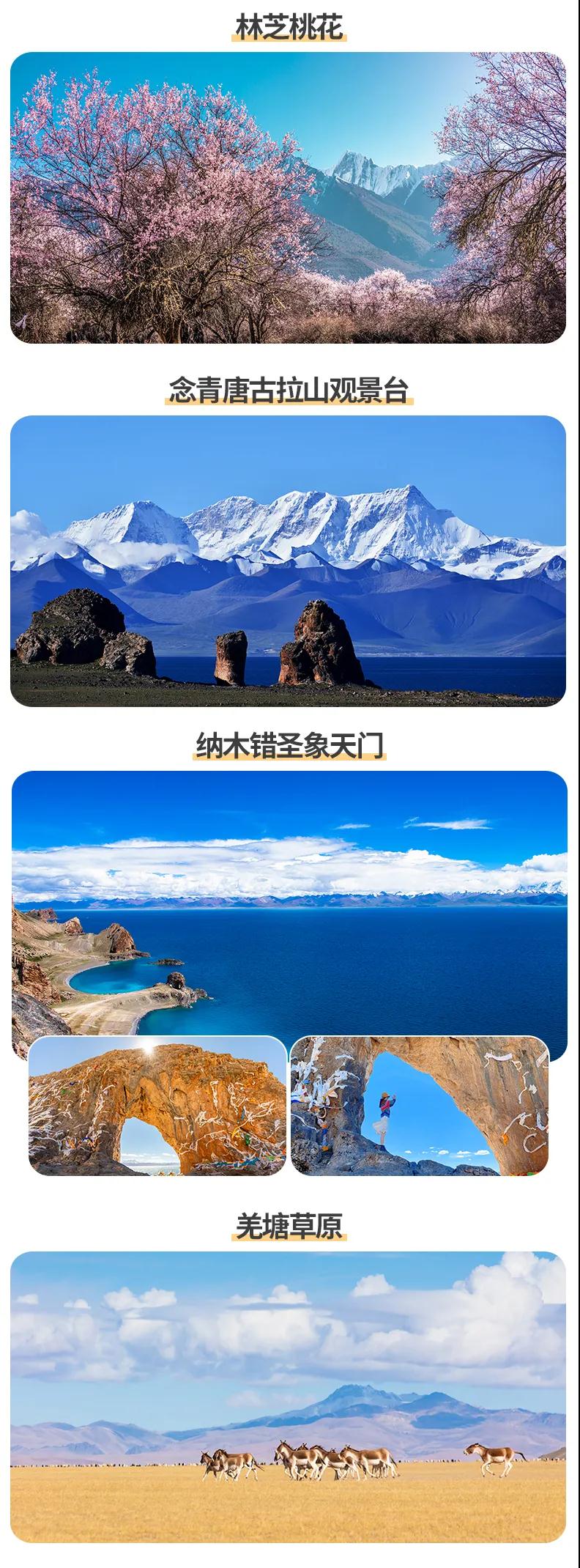 林芝桃花+金川梨花+南迦巴瓦峰+理塘+然烏湖+來古冰川+納木錯圣象天門+怒江72拐+羌塘草原+雅魯藏布大峽谷
