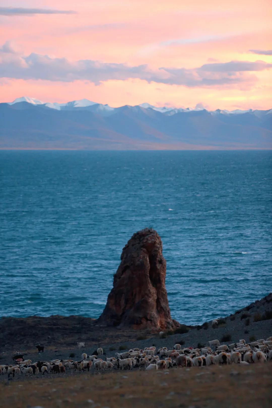 想看日出的朋友們今天就得起個早了哦~如果說納木措的日落是絢爛的,那它的日出就是寧靜而壯觀的。頭頂泛著魚肚白,然后當水天相接的地方閃現(xiàn)出第一縷光,金光便開始爭相恐后地從深淵中躍出來,打破這太過沉默的晨,直到這輪旭日完全沖破云層,晨曦播撒在納木措的湖面上、山坡上、草地上,柔和的光暈照亮了整個大地。見證靜謐如何生出熱鬧,見證黑夜如何誕出光明,除了壯觀,別無他言。