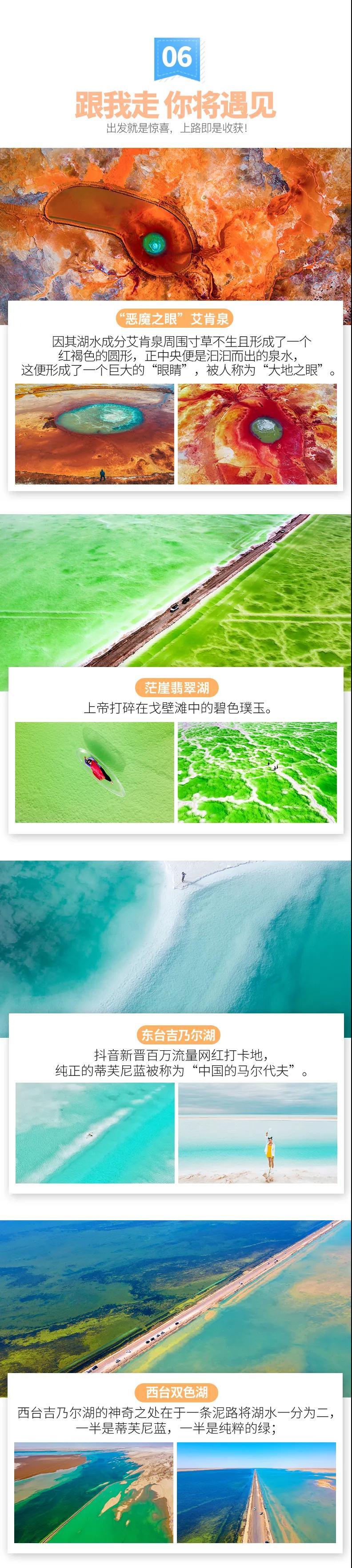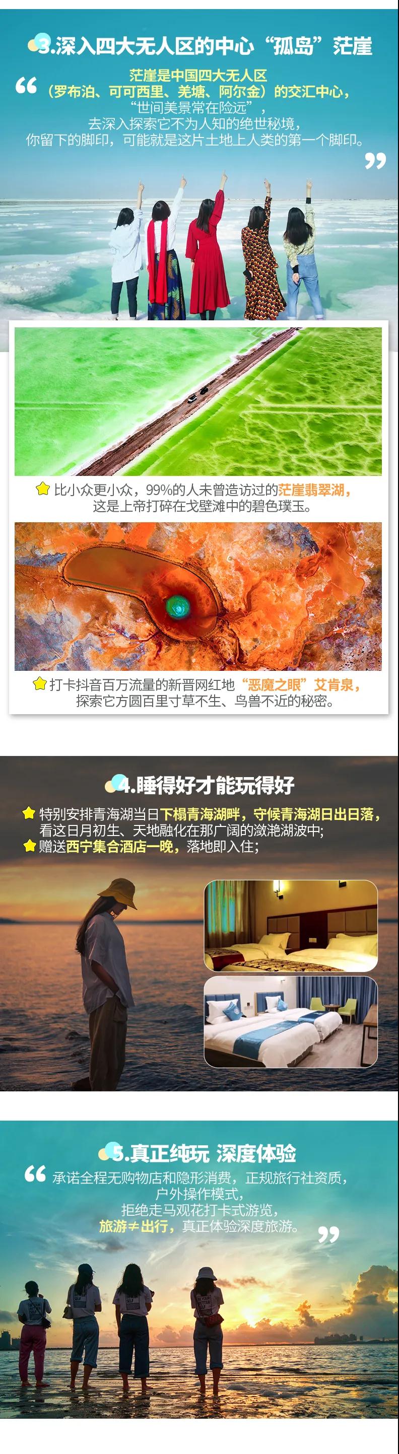 (5)茫崖翡翠湖、東/西臺(tái)吉乃爾湖、艾肯泉為小眾未開(kāi)發(fā)景點(diǎn),往年不設(shè)門票,若今年收費(fèi)門票或環(huán)保費(fèi)由游客自理。