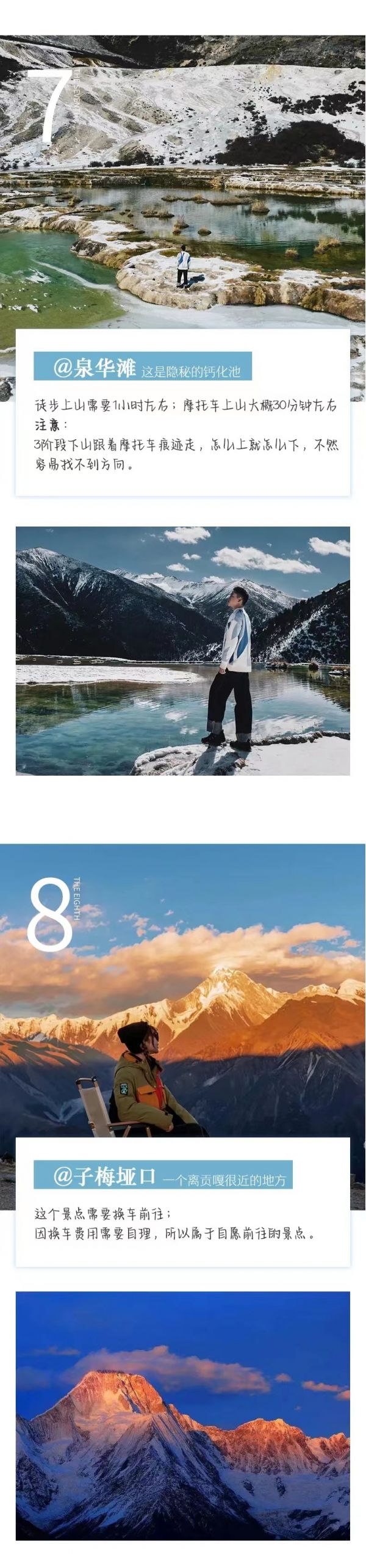 早餐后出發(fā),前往冷嘎措, 徒步時(shí)間步 2-3 小時(shí)(可選擇騎馬單面 200,或者摩托車(chē)往返200,費(fèi)用自理),到達(dá)冷嘎措自由拍攝大片( 海拔4500 左右,切記帶上厚外套, 以及帽子圍巾墨鏡,冷噶措風(fēng)大溫度低,以防感冒高反), 觀貢嘎雪山、藍(lán)冰(藍(lán)冰根據(jù)溫度決定)然后下撤返回(冬季若遇大雪下撤時(shí)間根據(jù)實(shí)際情況安排),返回途中可以繼續(xù)前往泉華灘進(jìn)行游玩。晚上入住上木居。