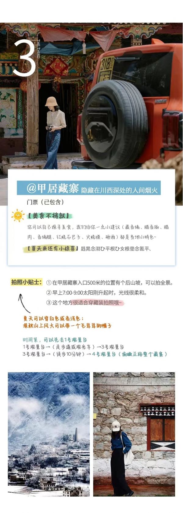 甲居藏寨 - 雅拉雪山觀景臺(tái) - 墨石公園 - 塔公草原 - 魚(yú)子西 - 新都橋鎮(zhèn)