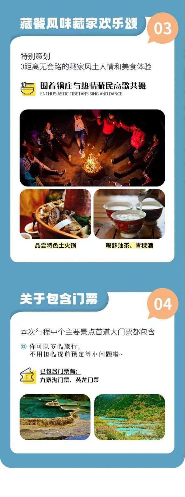 不含景區(qū)配套設(shè)施及小交通不含九寨溝觀光車90元/人(必須消費);不含黃龍上行索道80元/人,下行索道40元/人;黃龍定位講解器30元/人;黃龍電瓶車20元/人(自愿乘坐,每天5000張票,旺季請?zhí)崆邦A(yù)定)如需乘坐,請在報名時第一時間在公眾號或者攜程購買;景區(qū)保險:九寨溝景區(qū)保險10元/人自理;黃龍景區(qū)保險10元/人自理;