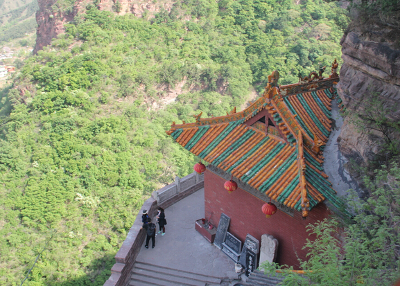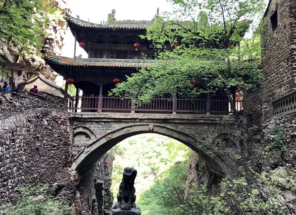 一絕“橋樓殿”。橋凌駕于百仞峭壁之間,仰視藍天一線,俯首萬丈深淵。形制如同趙州橋敞肩拱式。橋上建樓,云飛樓動,樓內(nèi)建殿,殿內(nèi)三尊大佛。真是“千丈虹橋望入微,天光云彩共樓飛”,不是仙境勝似仙境,疑是天堂落塵埃?,F(xiàn)為中國三大懸空寺之一。