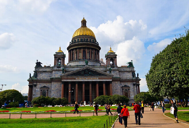今天部分拍攝點(diǎn)包括夏宮花園,瓦西里島以及十二月黨人廣場(chǎng)。【圣伊撒基耶夫大教堂】(外觀約10分鐘)也叫圣伊薩基輔大教堂,始建于1707年,已有300年歷史。廳和殿皆以大理石裝飾,且有以貴重的藍(lán)、綠孔雀石材質(zhì)建成的立柱,美不勝收。被認(rèn)為是僅次于羅馬梵蒂岡圣彼得大教堂、德國(guó)科隆大教堂的世界第三大教堂。伊薩基耶夫教堂,是圣彼得堡的象征。晚餐后入住酒店休息。交通:巴士
