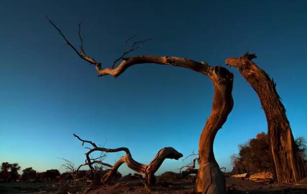 這里是一大片死去的胡楊林。胡楊千姿百態(tài)的造型在這里體現(xiàn)得淋漓盡致,有的直刺藍(lán)天,有的彎曲盤旋,還有的轟然倒下,散落了滿地的樹干,裸露的枯根在空中扭曲著,是最能出佳作的地方,拍攝黃昏日落美景。