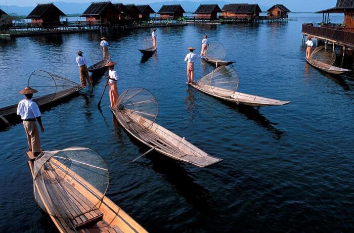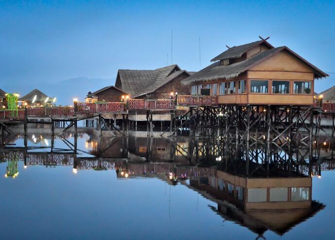 飯店內(nèi)早餐后,乘坐當(dāng)?shù)靥厣未斡[風(fēng)光旖旎的茵萊湖。茵萊湖是緬甸第二大湖,三面環(huán)山,水質(zhì)清澈,湖底水草清晰可見,湖水的顏色隨著每天日出日落而發(fā)生變化。當(dāng)?shù)匾疬_(dá)族人的村寨依湖而建,高腳屋、學(xué)校、商店等各種生活設(shè)施均佇立水中,當(dāng)?shù)厝说娘嬍称鹁泳篮?,交通往來全依靠船只,是名副其?shí)的水上村寨。當(dāng)?shù)厝颂赜械膭澊绞绞钦驹诖?,手腳并用的劃船。乘船參觀坐落在湖上的【水中佛塔】,在此可以欣賞俗稱【貓?zhí)?/strong>】的【波道烏寺】中的緬甸貓?jiān)谒轮猩说挠?xùn)練下,可以為游人表演鉆圈,寺中的五世佛像是艷麗湖的至尊,寺中的佛塔金光燦燦,全寺全部由柚木建成,木雕技藝精湛,其本身就是一座藝術(shù)寶庫;參觀水上【手工織布制衣作坊】、【卷煙作坊】、【鐵器生產(chǎn)作坊】,與【長頸族家庭】拍照,參觀當(dāng)?shù)孛恐芤淮蔚募小?strong>水上市場(chǎng)】,領(lǐng)略緬甸獨(dú)特的水上村寨生活。午餐在風(fēng)光奇美的【水上餐廳】用餐,品嘗湖中的特產(chǎn)魚。晚入住水邊的木屋別墅。