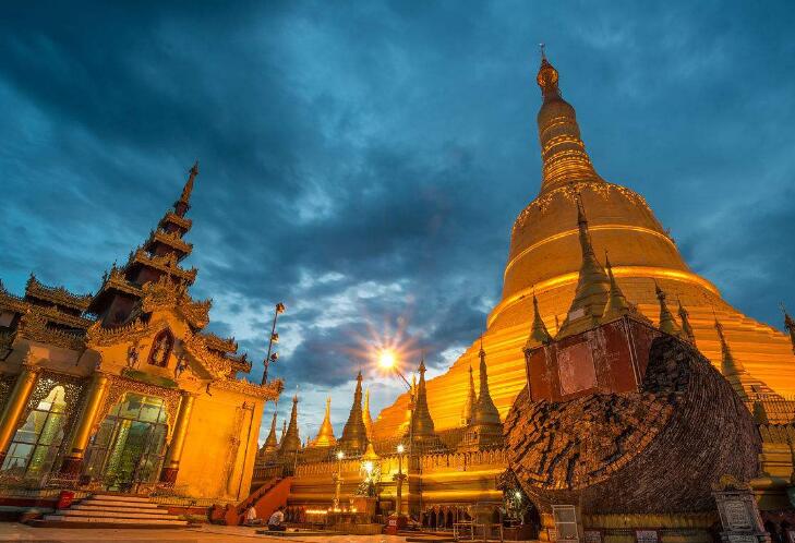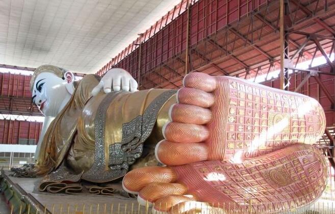 早餐后,返回仰光,參觀:世界各國佛教徒第六次大會(huì)開會(huì)地點(diǎn)、能容納萬人的【摩哈巴沙納石窟道場(chǎng)】及【世界和平塔】,參觀仰光最大的【巧塔基六層臥佛】、【摩哈班都拉花園獨(dú)立紀(jì)念碑】、【殖民時(shí)代建筑物】等,傍晚游覽著名的【瑞德貢大金塔】,此塔是仰光市的地標(biāo),始建于2500年前,塔頂及塔身以7噸黃金覆蓋,頂上金質(zhì)寶傘下有一直徑27公分的黃金鉆石球,球面鑲有鉆石和各色寶石多達(dá)7000余顆,塔周環(huán)立68座各式小金塔,簇?fù)碇笏纬山鹚?,尤其夕陽西下時(shí)場(chǎng)面十分壯觀富麗。晚上前往南帝達(dá)碼頭,在【格拉威皇家船餐廳用自助晚餐】并觀賞【緬甸民族歌舞表演】。
