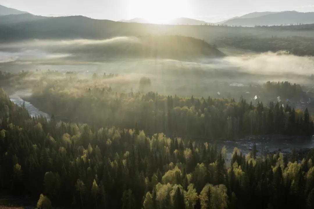 額爾齊斯河就是這么一條走不同尋常之路的河流。一路呼嘯奔騰,奔著北冰洋而去的它,也滋養(yǎng)了兩岸的土地。這里實(shí)在太適合航拍了,隨手一按就是一張媲美明信片的風(fēng)景大片。