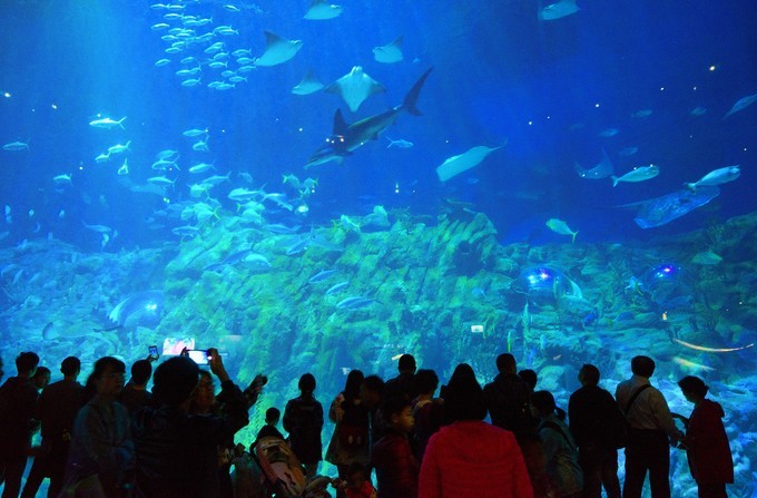 鯊魚館,我印象最深刻的展館,沒有之一??催^了國(guó)內(nèi)好幾個(gè)地方的海洋館,這里的鯊魚是我見過種類最多、數(shù)量最多、個(gè)頭最大、看起來最“嚇人”的。而且展館的建筑設(shè)計(jì)很科學(xué),從水面螺旋向下,方便游客參觀所有高度上的鯊魚。逛這個(gè)館的時(shí)候,館里統(tǒng)共十個(gè)人不到。絕對(duì)值回票價(jià),想看多久看多久,不用擠來擠去看人頭。為什么呢?那是因?yàn)榇蠹胰慷加咳タ春Q髣?chǎng)最早的11:30那一場(chǎng)表演了。那個(gè)時(shí)間點(diǎn)左右,我們好像穿越到了一個(gè)無人的公園,徹底享受了一把超級(jí)vip的待遇。可惜當(dāng)時(shí)不知道,沒去再玩幾個(gè)排隊(duì)的項(xiàng)目,等到這短短半個(gè)小時(shí)左右的時(shí)間紅利一過,后面又恢復(fù)到處都排隊(duì)的狀態(tài),一直持續(xù)到離園。