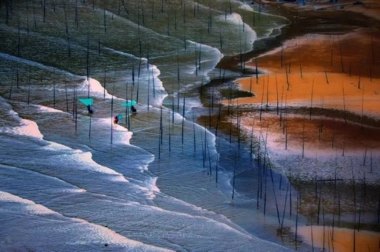 上午:北兜拍攝日出 紫菜場風光,涵江風光,這時候紫菜養(yǎng)殖場,拉竹竿掛苗繩,海面船只穿梭,漁民勞作一派繁忙的景象,滿灘滿海都是竿影人影船影,畫面任你裁減,紫菜還會吸收不同光源;