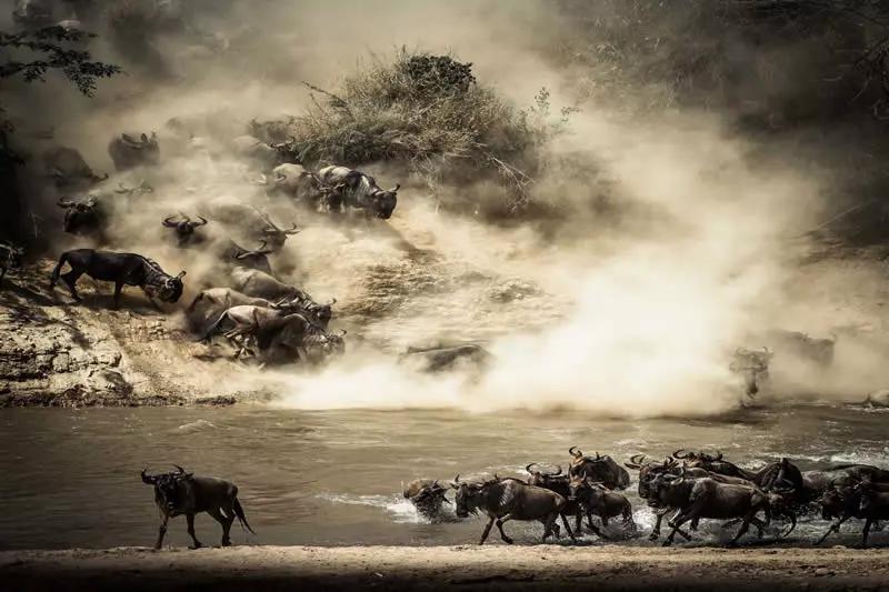 每年馬賽馬拉都會(huì)上演世界上最偉大的自然奇觀,那就是舉世聞名的動(dòng)物大遷徙。從7月到10月,位于北方的馬賽馬拉因連綿的降雨而孕育出新鮮青草地,芬芳的青草氣味,將一百三十萬原居于南面塞倫蓋蒂的牛羚深深吸引,使之匯聚成為動(dòng)物世界最大的一組移動(dòng)群體,并且,無懼水里那兇猛的大鱷魚,前樸后繼的,前呼后擁的橫河跨境,進(jìn)入新天地。他們?cè)竭^邊坦肯邊境進(jìn)入開闊的馬賽馬拉, 在廣袤的地平線上如浪潮般一波一波涌進(jìn)來。如斯景象,也造就了獨(dú)步天下,舉世無雙的牛羚(角馬)大遷徙。