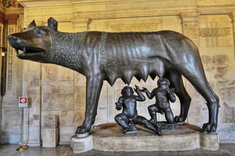 傳說公元前8世紀(jì),古希臘君主兩個(gè)襁褓中的兒子,在權(quán)位爭斗中被人投入臺伯河,順流漂到這座7丘之地,兩個(gè)嬰孩兒喝狼奶撿回小命。