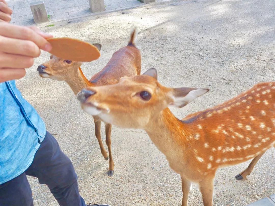 奈良公園里很多食品店向游客出售喂鹿的“餅干”。買好后只要“咯咯”一叫,就會(huì)有鹿聞聲而來,吃完之后,一頭頭鹿還會(huì)像懂事的孩子般,彬彬有禮地點(diǎn)頭離去,真的好有趣。