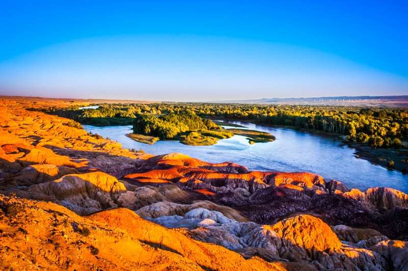 五彩灘風(fēng)景區(qū)前有大型的風(fēng)力發(fā)電網(wǎng)站。北岸山勢起伏、顏色多變,其是由激猛的流河侵蝕切割以及狂風(fēng)侵蝕作用而共同形成。由于河岸巖層間抗風(fēng)化能力的強弱程度不一而形成了參差不齊的輪廓,這里的巖石顏色多變,且在落日時分的陽光照射下,巖石的色彩以紅色為主,間以綠、紫、黃、白、黑及過渡色彩,色彩斑斕。每當(dāng)刮風(fēng)的時候,溝壑里、巖石下,到處都會發(fā)出長短不一、高低不同的怪叫聲。
