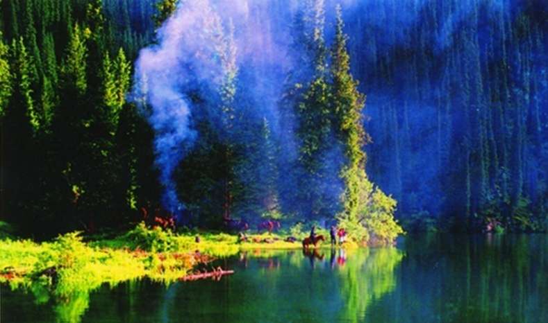 從夏塔古城向南一走到入山口,道路兩邊一個高過一個的高大土堆幕鱗次櫛比,向人們展現(xiàn)了烏孫時期國力的強大與草原文化的具體內(nèi)涵,入山以后,自然景色漸漸秀麗,兩邊茂密的原始森林懸掛在人們視線內(nèi)的半山腰,其中溝的西邊有現(xiàn)代當(dāng)?shù)鼐用窭靡粋€小山坡半自然地圈養(yǎng)鹿場;向南古道迂回攀升,異常險峻,在短短的一公里范圍內(nèi),相對高度增加了200多米,在向山上走,前面豁然開朗。