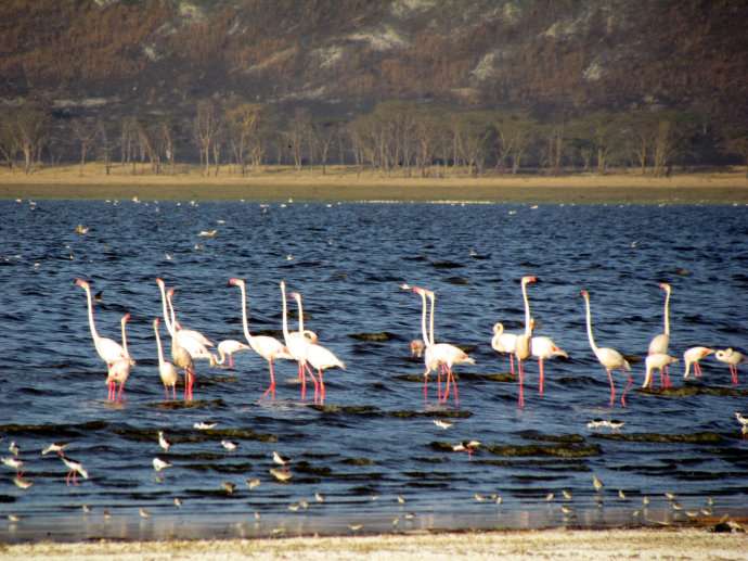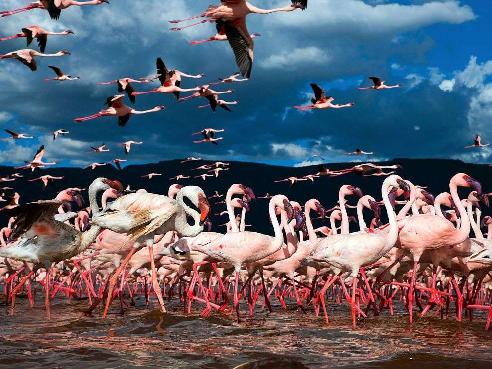 東非大裂谷還是一座巨型天然蓄水池,非洲大部分湖泊都集中在這里,大大小小約有30來個,例如阿貝湖、沙拉湖、圖爾卡納湖、馬加迪湖、馬拉維湖、坦噶尼喀湖等。這些裂谷帶的湖泊,水色湛藍(lán),遼闊浩蕩,千變?nèi)f化,不僅是旅游觀光的勝地,而且湖區(qū)水量豐富,湖濱土地肥沃,植被茂盛,野生動物眾多,大象、河馬、非洲獅、犀牛、羚羊、狐狼、紅鶴、禿鷲等都在這里棲息。坦桑尼亞、肯尼亞等國政府,已將這些地方辟為野生動物園或者野生動物自然保護區(qū),比如,位于肯尼亞峽谷省省會納庫魯近郊的納庫魯湖,是一個鳥類資源豐富的湖泊,共有鳥類400多種,是肯尼亞重點保護的國家公園。在結(jié)眾多的鳥類之中,有一種名叫弗拉明哥的鳥,被稱為世界上最漂亮的鳥,一般情況下,有5萬多只火烈鳥聚集在湖區(qū),最多時可達(dá)到15萬多只。當(dāng)成千上萬只鳥兒在湖面上飛翔或者在湖畔棲息時,遠(yuǎn)遠(yuǎn)望去,一片紅霞,十分好看。