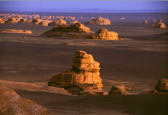 白天,遠(yuǎn)遠(yuǎn)望去,沙漠幻景猶如煙波浩渺的大海,整個"雅丹魔鬼城"恍若飄浮其中。傍晚蜃景隱去,整個"雅丹魔鬼城"籠罩在夕陽余輝下,金碧輝煌中更顯幾分神秘,幾分肅穆。夜幕降臨后,狂風(fēng)呼嘯,整個"魔鬼城"又陷入恐怖的氣氛中,令人毛骨悚然。
