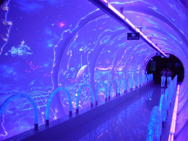國內(nèi)絕無僅有的熒光純手工壁畫,由日本著名熒光畫大師遠(yuǎn)山先生花了3個(gè)多月畫成,價(jià)值超三百萬元。整個(gè)壁畫描述了海洋形成、發(fā)展過程和未來的遐想,即海洋的昨天、今天和未來,在這里你可以完全放飛你的想象;該壁畫另一奇妙之處:如果關(guān)閉熒光燈,壁畫會(huì)變成一面白墻,什么也不見,但是打開熒光燈后,畫面栩栩如生,層次分明,你不得不驚嘆大師的高超技藝。