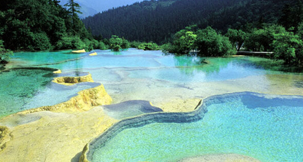 進(jìn)入黃龍景區(qū),首先看到的是一組精巧別致、水質(zhì)明麗的池群--迎賓池。池子大小不一,形狀奇特,色彩艷麗,錯(cuò)落有致,四周山岳環(huán)峙,林木蔥蘢,山間野花競放,彩蝶飛舞。山間石徑曲折盤旋,點(diǎn)綴著觀景亭閣,倍添情趣。