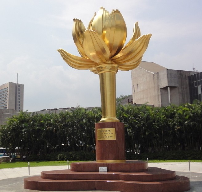 主體部分由花莖、花瓣和花芯組成,青銅鑄造,表面貼金裝飾,形似蓮葉的基座部分則由二十三塊紅色花崗巖相疊組成,寓意澳門(mén)三島。蓮花是澳門(mén)特別行政區(qū)區(qū)花,蓮花盛開(kāi)、亭亭玉立、冉冉升騰,象征澳門(mén)永遠(yuǎn)繁榮昌盛。