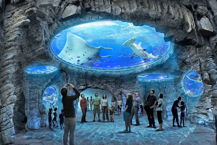 海洋館是世界最大的水族館之一。水體寬22米,長(zhǎng)38米,水深達(dá)7米,分為4層,觀眾可由通道環(huán)繞參觀。該館按珊瑚礁布局,分深湖和瀉湖兩部分:深湖依據(jù)堡礁設(shè)計(jì),瀉湖參照緣礁摹造,兩湖海水相通。館內(nèi)放養(yǎng)了太平洋島嶼及南中國(guó)海魚類5000多條,約400多種,從體長(zhǎng)不到2厘米的鹽雀鯛到身長(zhǎng)3米的豹紋鯊,還有海鰻、神仙魚、石斑魚等各種珊瑚礁魚類。該館還設(shè)有“珊瑚和珊瑚礁”展覽,介紹有關(guān)珊瑚礁的形成。