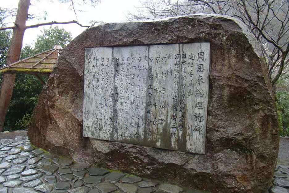 1917年9月,周恩來東渡日本留學。1919年4月在回國途中,他游覽了京都,并撰寫白話詩四首。1979年1月22日,由京都各日中友好團體和知名人士聯(lián)合倡議,成立了“周恩來詩碑籌建委員會”。1979年4月16日,詩碑建成。