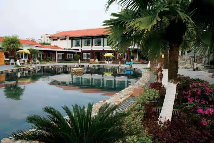 房、娛樂、會務(wù)、健身于一體的健康、休閑、度假、旅游樂園。度假村傍山依水,環(huán)境幽雅,景色怡人。江埡溫泉水質(zhì)清澈碧透,水溫常年在54度左右,溫泉水富含對人體有益的多種礦物質(zhì)元素。泉水伴著春夏秋冬、日月星辰不停不歇地從地心涌出。江埡溫泉主要硬件特色是高標(biāo)準(zhǔn)的自然園林式露天溫泉與室內(nèi)溫泉,建有同心池、六福湯、瀑布溫泉、石板溫泉、椰奶溫泉、花草溫泉、咖啡溫泉、紅酒溫泉等,布局體現(xiàn)出鄉(xiāng)土格調(diào),鵝卵石、青石板鋪地, 假山瀑布,小橋流水,20余種各賦特色、各具功能的溫泉池鑲嵌其中, 一派恬淡寧靜的詩情畫意。