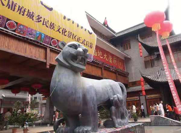 古庸國里這一感恩于虎的故事代代相傳,經(jīng)久不息。土家人尚虎,虎是土家人的圖騰。人們景仰施愛于世人的恩虎,即塑像一尊,陳于府城,播灑愛情,傳揚(yáng)平安。據(jù)說,這尊虎乳銅雕是目前國內(nèi)最高大的銅虎(此虎凈重約4噸),由青銅鑄造?;⒌纳硐掠幸粋€小孩兒和一只小老虎在吃奶。看來,這虎應(yīng)該是張家界的標(biāo)志了,就如同獅是新加坡的標(biāo)志一樣。
