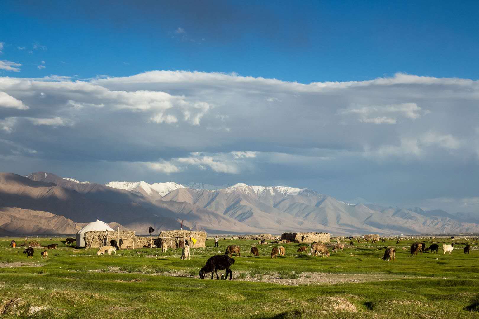 阿拉爾金草灘就在塔什庫爾干縣城邊上,在石頭城下,因那里有一個叫阿拉爾的鄉(xiāng)村,故得名阿拉爾金草灘,因有塔什庫爾干河流經(jīng)此處,這里水草豐美,牛羊遍地,和遠處的雪山白云藍天交融在一起十分漂亮。我們?nèi)サ臅r候夕陽夕照,碧綠的草灘一片金色,遠處牧人白色的氈房,羊群都沐浴在夕陽下,阿拉爾金草灘由此得名。