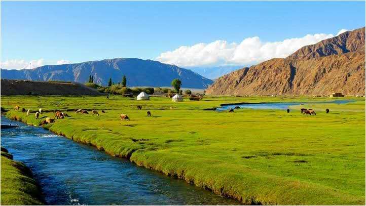 阿拉爾金草灘位于塔什庫爾干縣城東側(cè),塔什庫爾干河兩岸,占地面積20平方公里,屬帕米爾高原上的一片濕地。