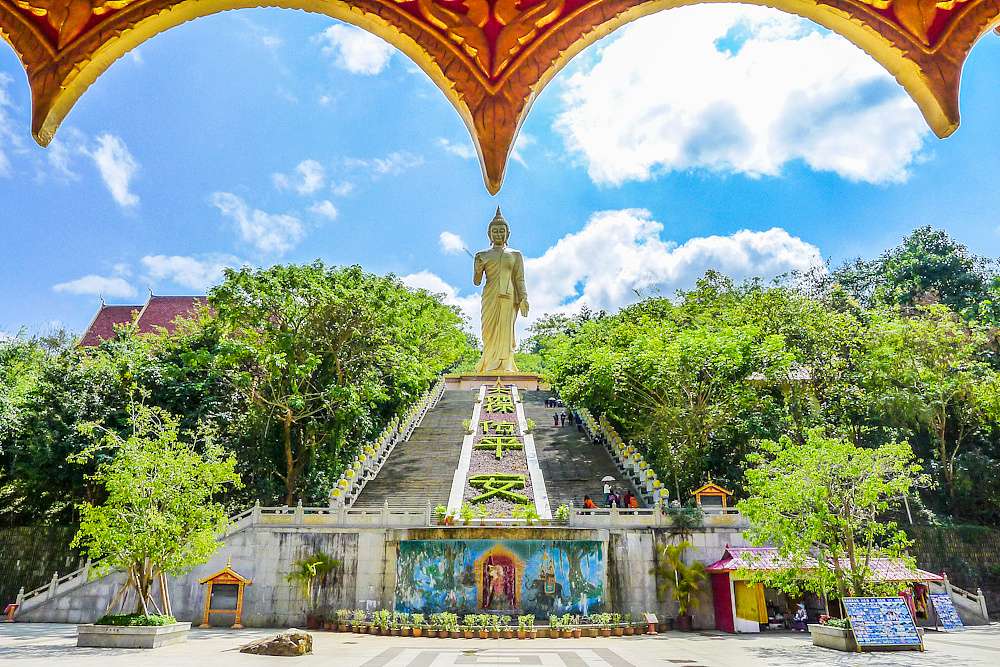 勐泐大佛寺位于云南省西雙版納傣族自治州州府景洪市城郊,按照國家AAAA級景區(qū)標(biāo)準(zhǔn)打造。勐泐大佛寺是在古代傣王朝的皇家寺院“景飄佛寺”的原址上恢復(fù)重建的,“景飄佛寺”是傣族歷史上一位名叫撥龍的傣王為紀(jì)念病故的王妃南紗維扁而修建。王妃一生信奉佛法,所以每逢節(jié)日傣王就親臨寺院,舉行大型法會,以紀(jì)念愛妃同時弘揚(yáng)佛法。據(jù)史料記載:“景飄佛寺”始建于明代,是南傳佛教象征十二版納的標(biāo)志性建筑之一,也是版納佛教活動的重要場所。該建筑在佛歷2883年(即公元1848年,清咸豐年間)戰(zhàn)爭中被毀,距今已有169年。佛寺于2005年開始重建,于同年3月9日舉行了大型的土地開光儀式,于2005年5月9日舉行了盛大的大殿奠基開光儀式,在大殿施工時,挖掘出大量的銀幣、銀盒、佛教法事用品等。佛寺于2007年11月3日一期工程竣工,竣工之時,邀請了海內(nèi)外108位高僧為佛寺舉行了盛大的開光大典,州內(nèi)外參加開光大典的各民族佛教信眾達(dá)65萬人之多。 占地面積400畝,佛寺依山而建,落差達(dá)122.8米,呈坐佛形,為國內(nèi)外所獨(dú)有。景區(qū)以佛祖釋迦牟尼的生平及佛寺活動為主線,巧妙融入到景觀及建筑群體中,充分展示南傳佛教的歷史與傳統(tǒng)文化色彩。從萬佛塔前廣場俯視景洪市區(qū),旖旎的熱帶風(fēng)光盡收眼底。