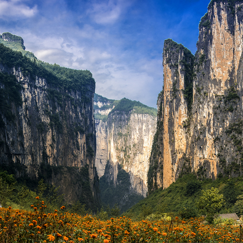 夔門兩側(cè)的高山,南名“白鹽山”,北曰“赤甲山”,拔地而起,高聳入云;近江兩岸則壁立如削,恰似天造地設(shè)的大門。這里的河寬只有百余米。“眾水會涪萬,瞿塘爭一門”。杜甫用一“爭”字,活畫出夔門的赫赫水勢。乘船入夔門,高約千米的赤甲、白鹽兩山對峙,滾滾激流、滔滔浪花就從這門中爭喧著擠擁進去。正因其水大河窄,故汛期水位,一日之間,可陡漲一、二十米,年水位的變幅,甚至可相差五十多米。白鹽山系因粘附在巖石上的含鈣質(zhì)的水溶液色似白鹽而得名;赤甲山因含有氧化鐵的水溶液粘附在風化的巖層表面,此山土石呈紅色,如人袒背,故名赤甲山。這兩座山都是石灰?guī)r,長期的風剝雨蝕,使兩岸巖壁,好似刀削斧砍一般,形成十分奇麗的自然景觀。版權(quán)所有山東聊城聊之旅國際旅行社有限公司,轉(zhuǎn)載必究!凡緩坡沖坪處,因有植被而呈蒼青色。面江迎風之絕壁陡巖,雖然寸草難生,而各現(xiàn)異彩,有白色、赤色、黃色、褐色等。這些色調(diào)和晨曦、晚霞、明月交相輝映,形成了“赤甲晴暉”、“白鹽曙色”和“夔門秋月”等勝景。