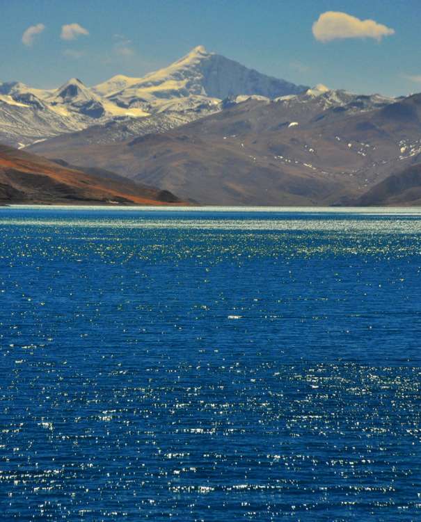 湖泊、雪山、島嶼、牧場、溫泉、野生動植物、寺廟等多種景觀為一體的、獨特的自然風(fēng)景區(qū),周圍 還有常年不溶的雪山冰峰,最高的達(dá)海拔7000多米。湖泊、雪峰與藍(lán)天融為一體,讓人流連忘返。不同時刻陽光的照射,羊湖會顯現(xiàn)出不同層次、極其豐富的藍(lán)色,羊卓雍措的水源來自四周念青唐古拉山脈的雪水,沒有出水口,雪水的流入與自然的蒸發(fā)達(dá)到一種奇特的動態(tài)平衡,湖水隨著光線變幻,演化成千變?nèi)f化的藍(lán)色。下崗巴拉雪山不遠(yuǎn)有一段很長的沿湖公路,在此停車駐足,或徒步至湖邊,甚至露營湖旁是感受羊湖的最好方式。