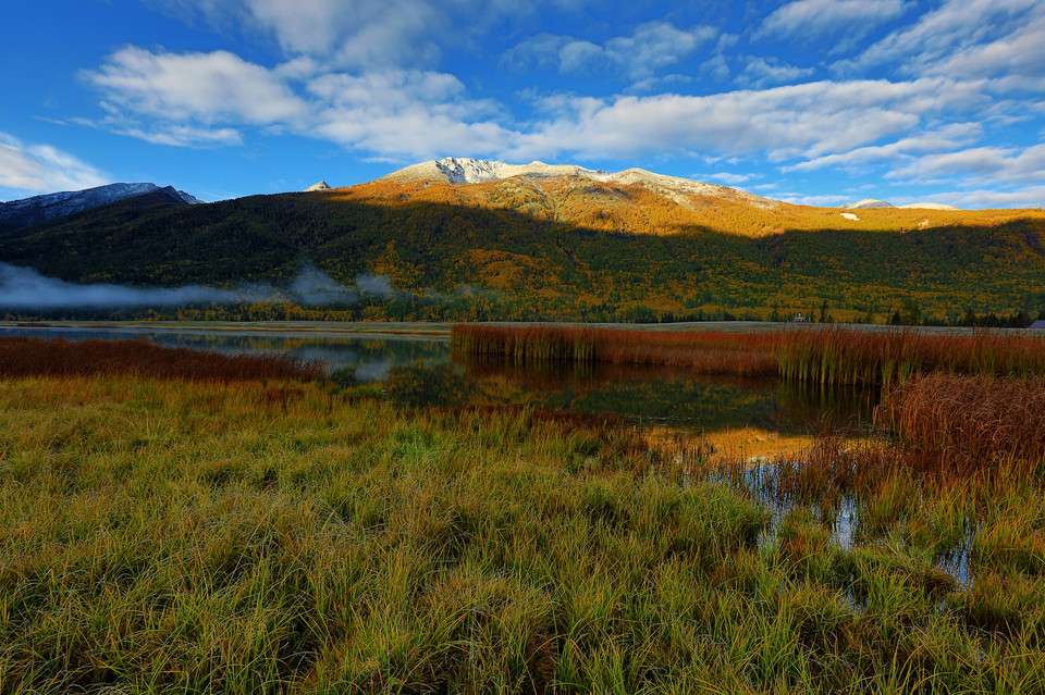 鴨澤湖位于禾木喀納斯蒙古族鄉(xiāng)境內(nèi)喀納斯村南邊,它是由喀納斯河改道后廢棄河段——牛軛湖洼地組成,呈長(zhǎng)形蝶狀,沿洼地南端形成一個(gè)南北走向的寬淺湖泊,形似蝶狀的一弘碧水與沼澤濕地連為一體,面積約1.3 平方公里。