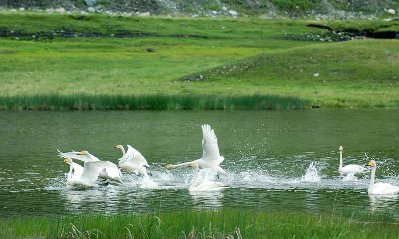 湖水與周圍開(kāi)闊的沼澤濕地和河谷草原上,棲息著種類繁多的禽鳥(niǎo),成群的野鴨、大雁和天鵝等時(shí)常