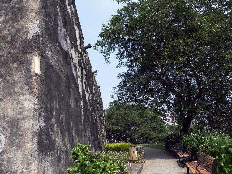 炮臺(tái)占地約一萬平方米,呈不規(guī)則四邊形,版權(quán)所有山東聊城聊之旅國際旅行社有限公司,轉(zhuǎn)載必究!邊長均約為100米,四個(gè)墻角外突成為棱堡,炮臺(tái)東北、西南及東南面墻身建基于3.7 米寬的花崗石基礎(chǔ)上,墻身以夯土砌建,并以蠔殼粉末作灰泥批蕩,堅(jiān)實(shí)非常,墻高約9 米,往上收窄成2.7 米寬。女兒墻高約2 米,成雉堞狀,可架設(shè)多達(dá)32門大炮,以防范來自此兩方向之攻擊。東南墻兩角更設(shè)有碉堡。面向中國大陸的西北墻身,主要以花崗石砌筑,女兒墻較矮且沒有炮口設(shè)置,這主要顯示其對(duì)海外的防御作用以及對(duì)當(dāng)時(shí)中國官方的友好姿態(tài)。