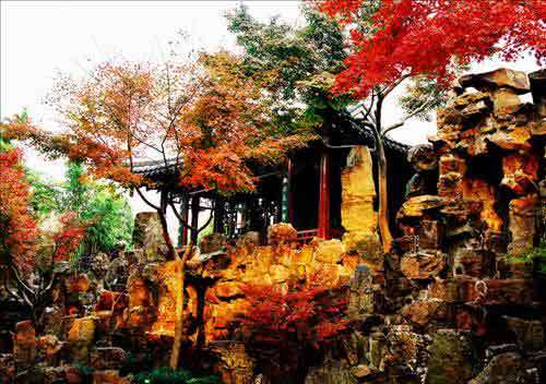 秋景是黃石假山,在園中東北角,用粗獷的黃石疊成。山頂建四方亭,山隙古柏斜伸,倚伴嶙峋山石。山上有三條磴道,一條兩折之后仍回原地,一條可行兩轉(zhuǎn),逢絕壁而返。惟有中間一路,可以深入群峰之間或下至山腹的幽室。在山洞中左登右攀,境界各殊,有石室、石凳、石桌、山頂洞、一線天,還有石橋飛梁,深谷絕澗,有平面的迂回,有立體的盤曲,山上山下,又與樓閣相通。秋山山頂置亭,形成全園的最高景點(diǎn)。