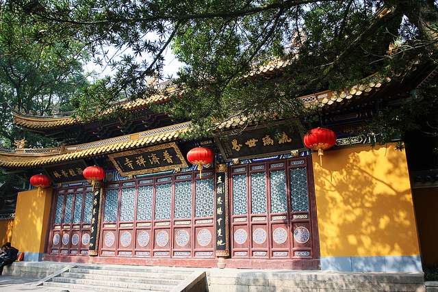 天王殿。亦稱金剛殿,面寬五間,進(jìn)深四間,重檐歇山。進(jìn)門迎面是一彌勒菩薩,光首、笑臉、袒胸、盤坐,一手拿一只布袋。據(jù)說他能將世人一切苦難裝入布袋之中。佛像兩旁有一副對(duì)聯(lián):“慈顏含笑笑天下之可笑之人,大腹可容容世間難容之事”,以勸人們慈悲大度為懷,用樂觀態(tài)度對(duì)待風(fēng)雨變幻的生活。彌勒菩薩后面的塑像是韋馱菩薩,昂然挺立,手持寶杵,據(jù)傳韋馱是神將之首,常于東、南、西三州巡游,守護(hù)伽藍(lán),屬護(hù)法神。兩旁的四大天王宛如四名衛(wèi)士在維護(hù)法門,他們是東、南、西、北四個(gè)方面的天王,各自手里拿著法器。殿后有香樟8株,直徑0.8-2米多,植茂蓋庭。