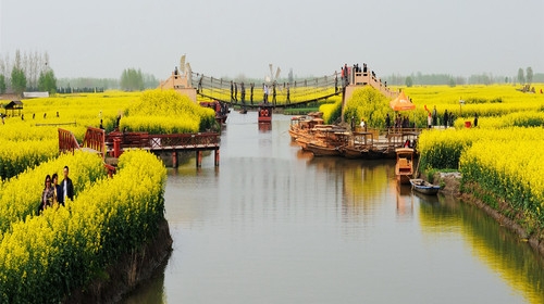 興化千島菜花風景區(qū),位于江蘇省興化市缸顧?quán)l(xiāng)東旺村和李中鎮(zhèn)黑高村東側(cè),總面積近萬畝。作為一座建成已有2300多年歷史的古城,興化有著深厚的文化積淀和獨特的水鄉(xiāng)美景:李中鎮(zhèn)得水上森林公園,以“樹在水中長,鳥在枝頭唱”而聞名;鄭板橋故居,不僅完整保存著鄭板橋生前的生活用品,更有鄭板橋手跡及歷代文人名士的墨寶。此外,還有《水滸傳》作者施耐庵的陵園、為明朝狀元宰相李春芳所立的“狀元坊”等一批文化景點。