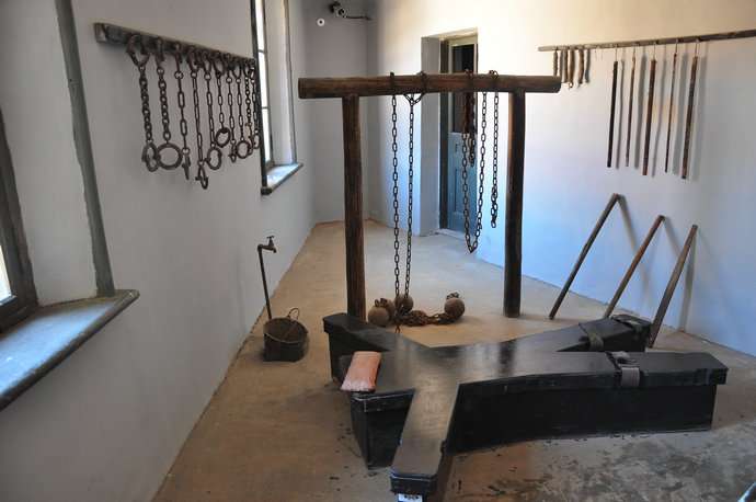 在監(jiān)獄的東北角有一棟二層樓房式的絞刑室。行刑時(shí),劊子手用白布蒙住被處死者的面部,將他強(qiáng)行按坐在活板上,脖子套上絞索,然后突然打開活板進(jìn)行絞殺。尸體被蜷曲著塞進(jìn)木桶釘上蓋,然后埋在監(jiān)獄外的荒地里。